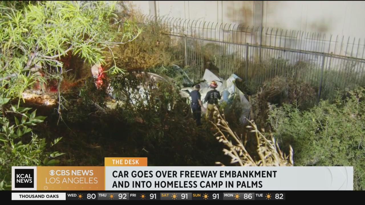 Car goes crashes into a homeless encampment after crashing off the 10 Freeway