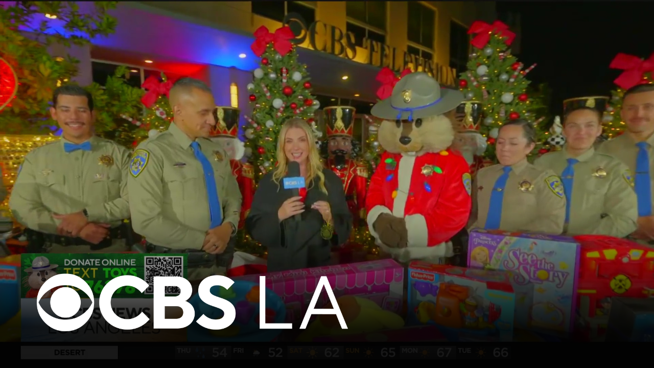 California Highway Patrol officers joined Evelyn Taft outside of the CBS Los Angeles studios on the first day of the CHiPs for Kids toy drive.