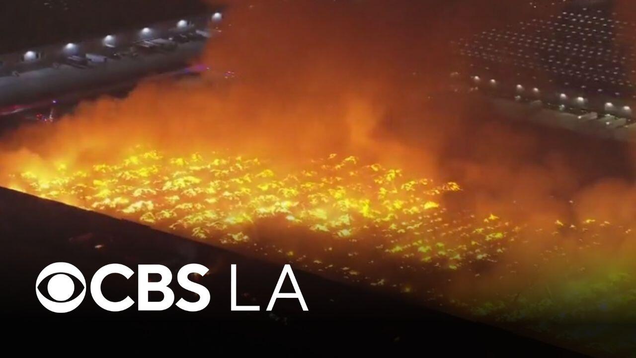 Several agencies are battling a massive 6-alarm fire at a warehouse in Ontario. Authorities said an individual was taken into custody as a possible arson suspect.