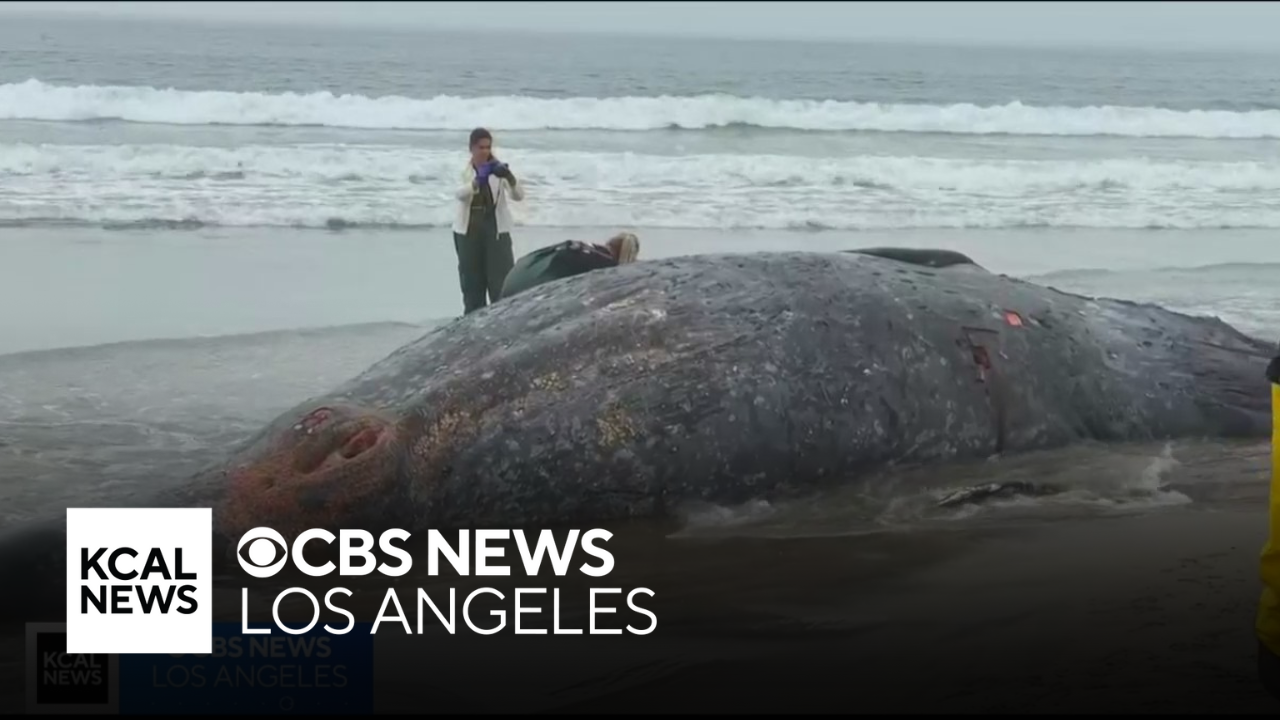 The whale washed ashore near Lifeguard Tower 50 on Sunday, according to wildlife officials.