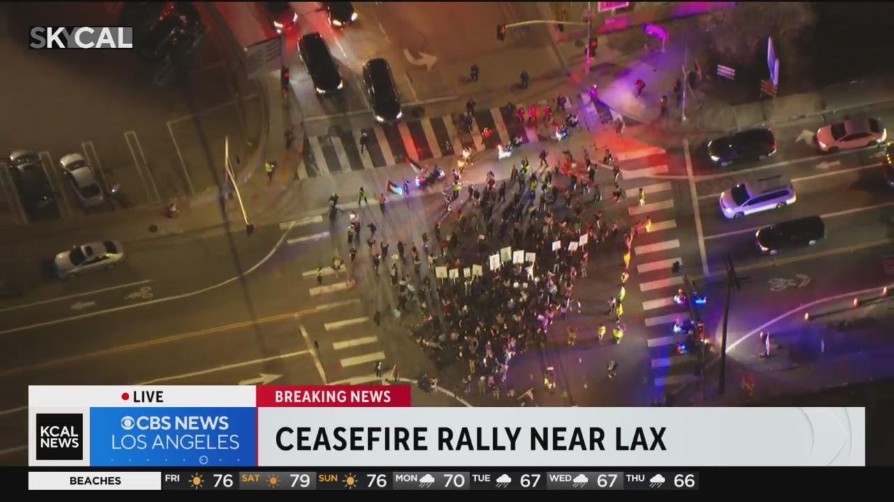 Demonstrators calling for ceasefire in Gaza block streets near LAX