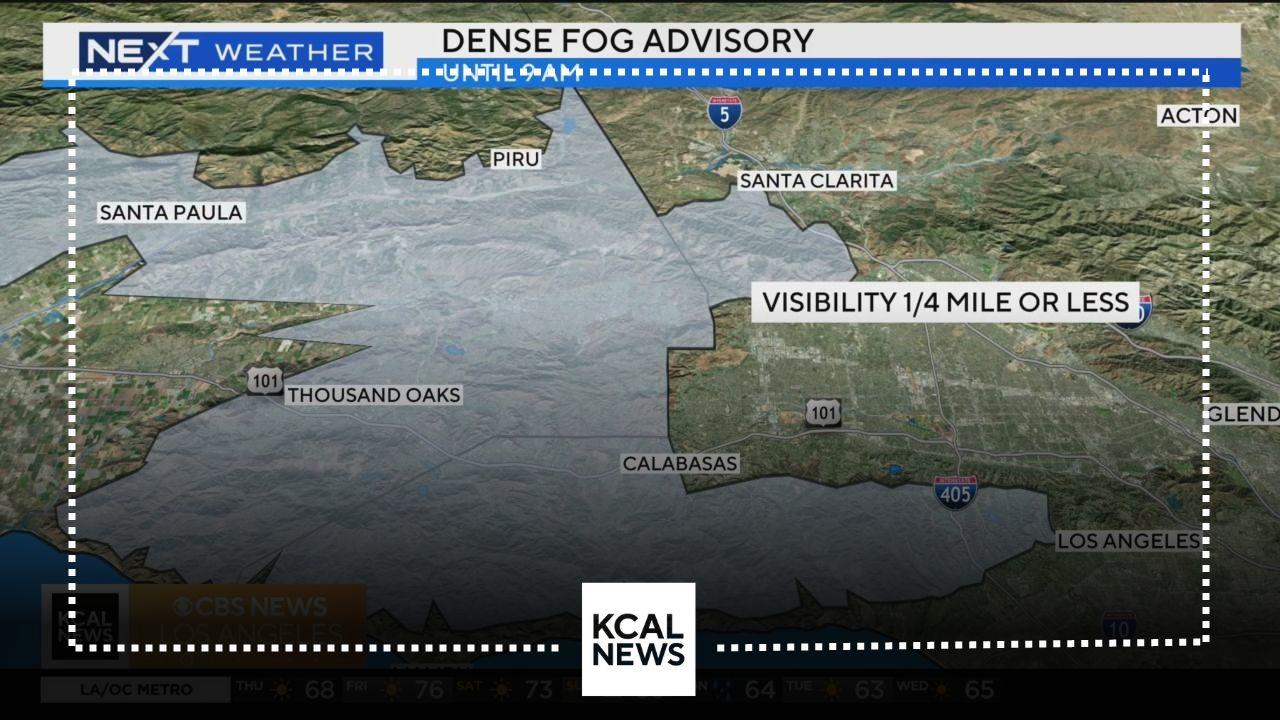 Dense fog advisory will be in effect for the San Fernando Valley until 9 a.m. Thursday. This will impact cities including Thousand Oaks, Calabasas, Simi Valley and Santa Paula.