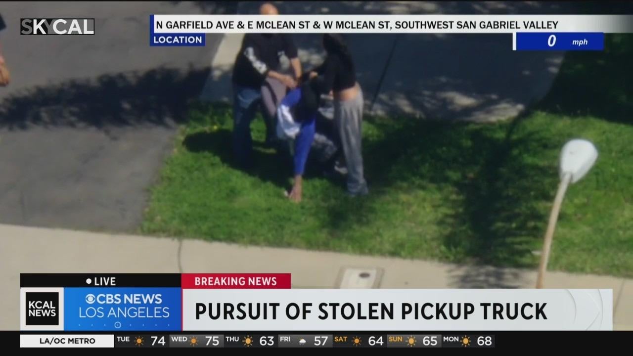 Driver of stolen white pickup jumps out of truck, runs onto a front lawn, and taken into custody by