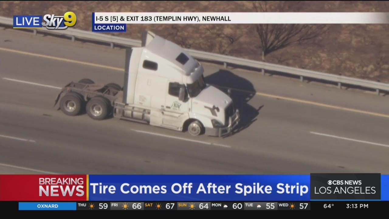 Front tire comes off big rig after spike strip