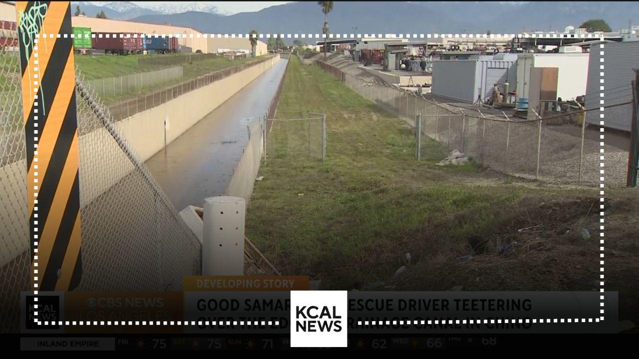 Good Samaritans help pull a vehicle to safety after teetering over a Chino drainage canal