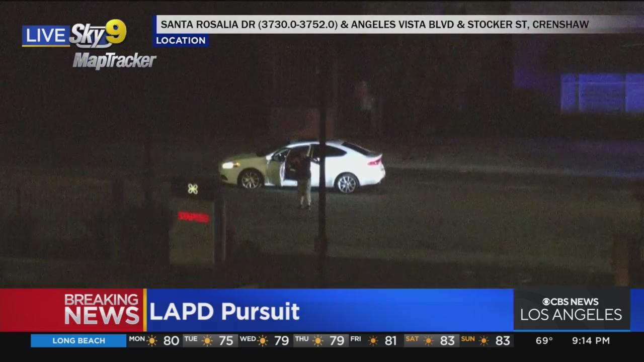 Sky9 was over the scene in South Los Angeles as the pursuit suspect, wanted for a carjacking, stopped and got out of the white sedan he was driving. The suspect surrendered to police at Santa Rosalia Drive.