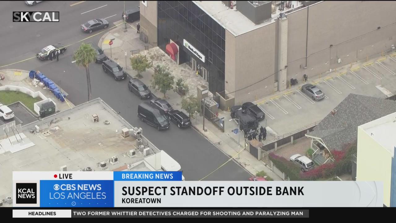 A knife-wielding suspect accused of walking into a Koreatown bank, moves to a standoff with Los Angeles police just outside the bank