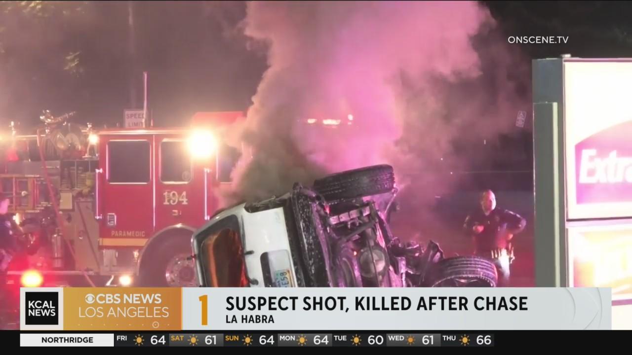 An armed robbery suspect was killed in an officer-involved shooting following a police pursuit and fiery crash in La Habra early Friday morning.