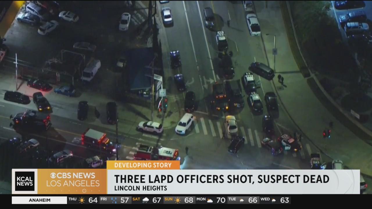 Three Los Angeles Police Department officers were in stable condition Thursday morning after they were shot in Lincoln Heights Wednesday evening in a shootout with a parolee at large.