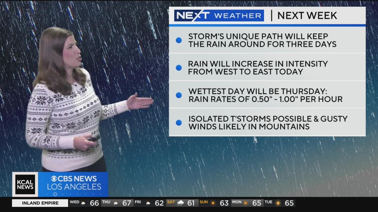 Marina Jurica goes over weather patterns and how much rain to expect in Southern California’s different regions over the next few days. The wettest day will be Thursday, with rainfall rates of .50” to 1” per hour.