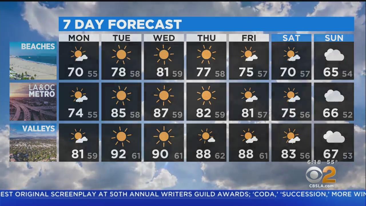 A high of 70 for the beaches and 81 for the valleys Monday.