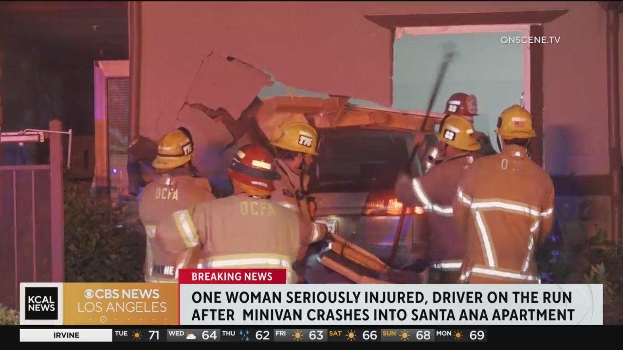 A van crashed into a Santa Ana apartment Monday night, injuring two occupants in the residence, and the driver fled the scene on foot. The driver remained at large Tuesday morning.