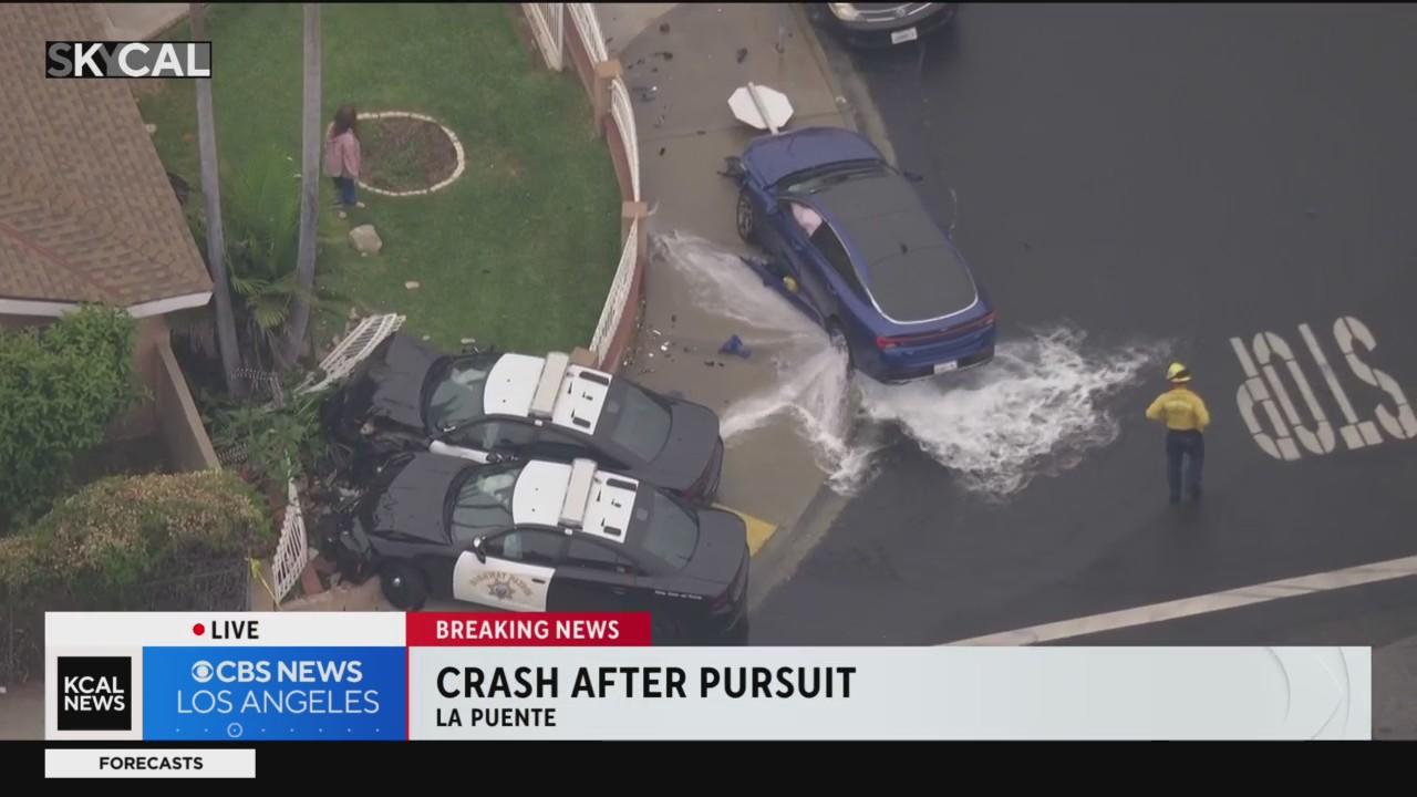 A high-speed pursuit with a motorcycle suspect came to a crashing stop in La Puente, when two California Highway Patrol cruisers veered off the road and slammed into the front yard of a home, causing another pedestrian driver to crash into a fire hydrant.