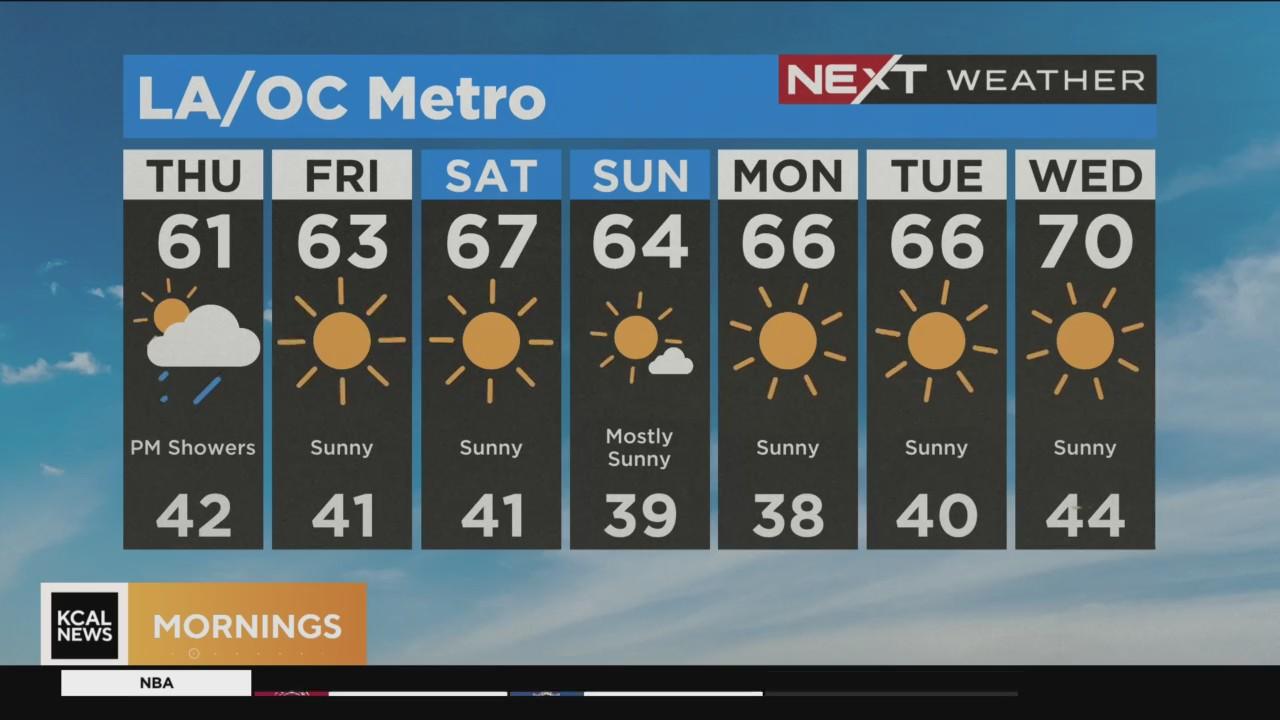 Cold start to Thursday morning. Cloudy skies, possible scattered showers later today in valleys and inland. Clear Friday. Warming up for a dry weekend.
