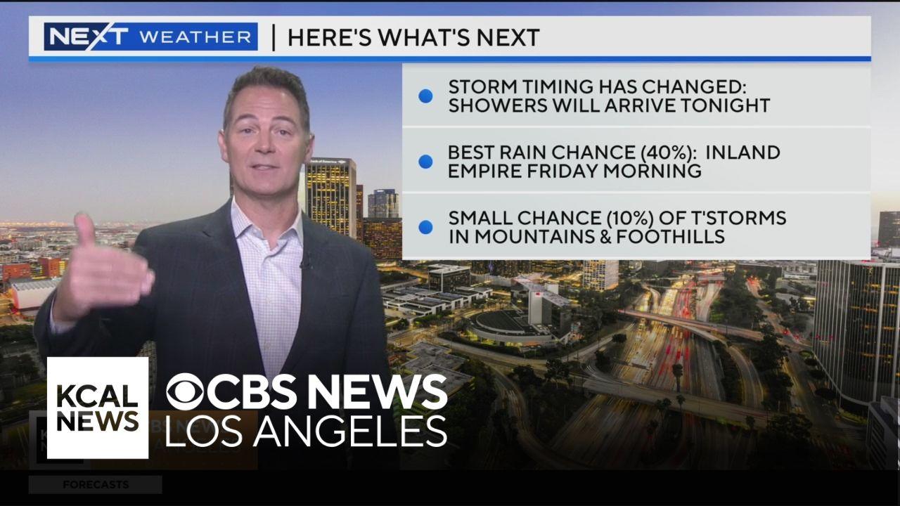 Showers are expected to arrive this evening, with the highest rain chance at 40% in the Inland Empire. The slow-moving storm brings a forecasted chance of showers in the Los Angeles area Friday morning.