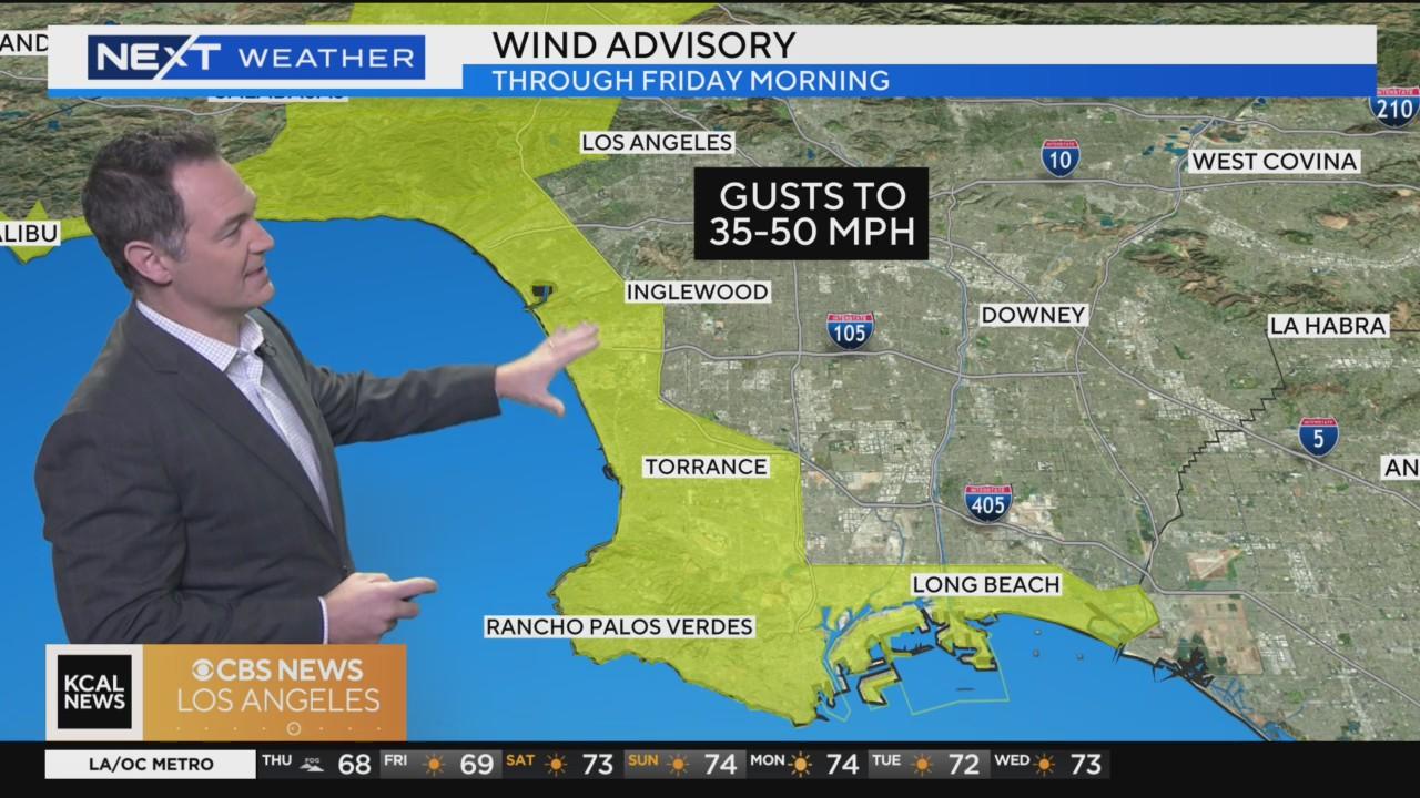 It will be foggy in the morning before a partly cloudy afternoon. Wind advisories in place for some areas until Friday morning. Highs will be in the 60s from the beaches to downtown Los Angeles and the San Fernando and San Gabriel valleys, the lower-60s in the Santa Clarita Valley and the upper-40s and 50s in the Antelope Valley.
