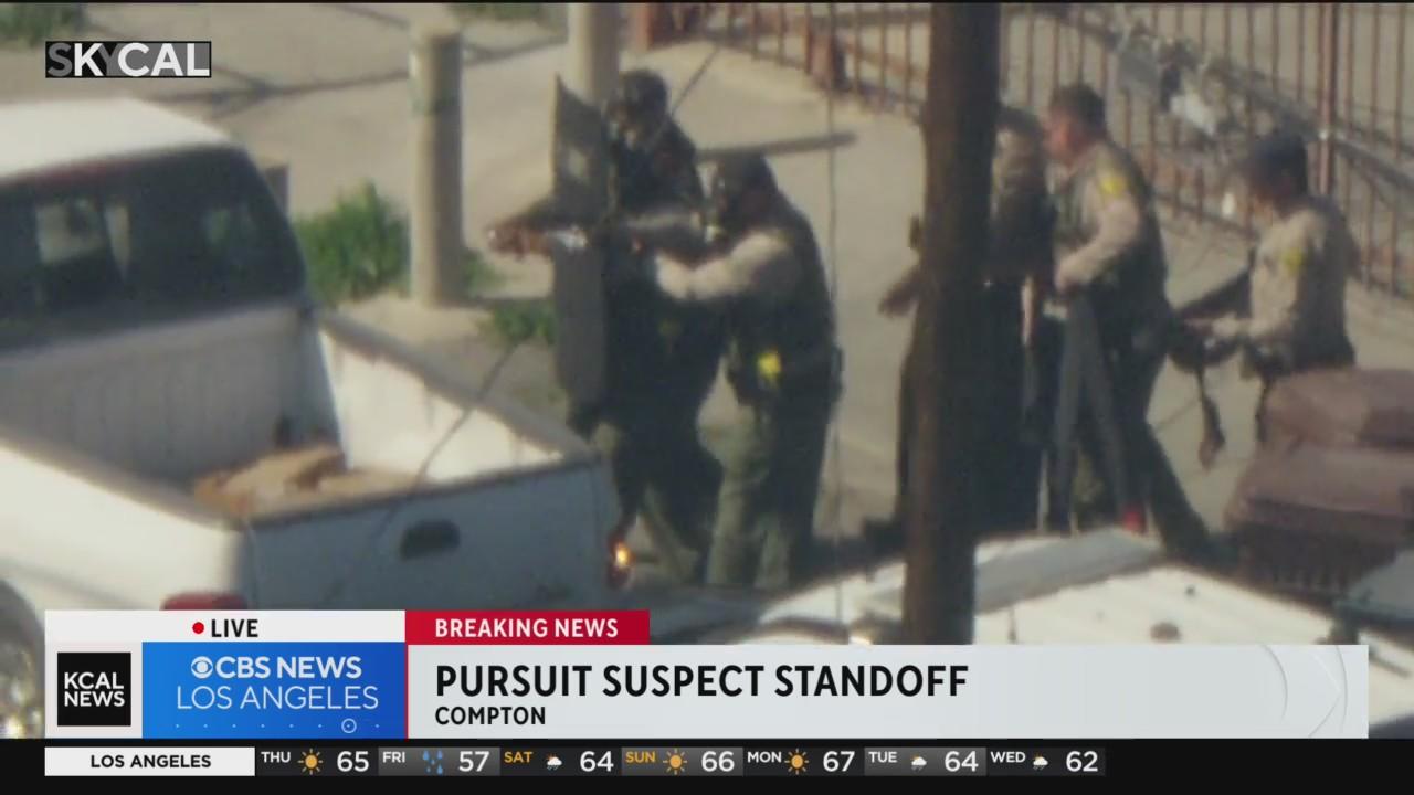 Police throw in another pepper ball into the suspect's truck as he refuses to get out and surrender. Police also lay down a spike strip.