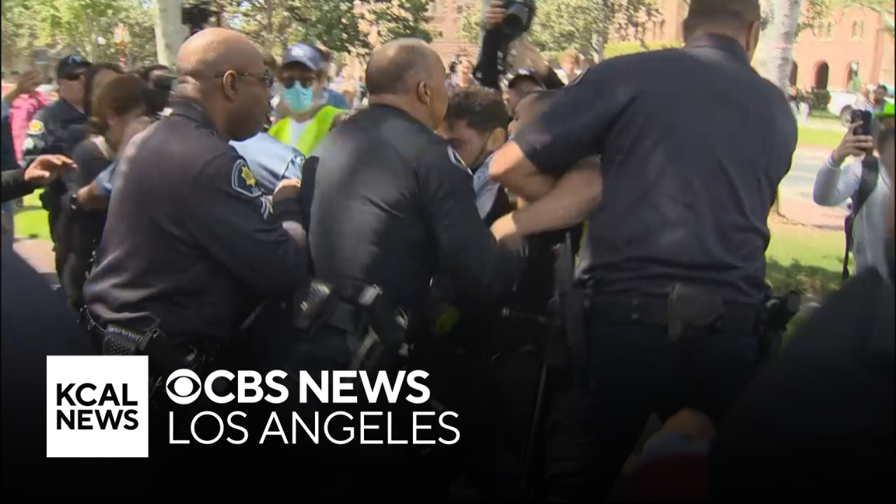 Pro-Palestinian protesters clash with campus police at USC's Alumni Park