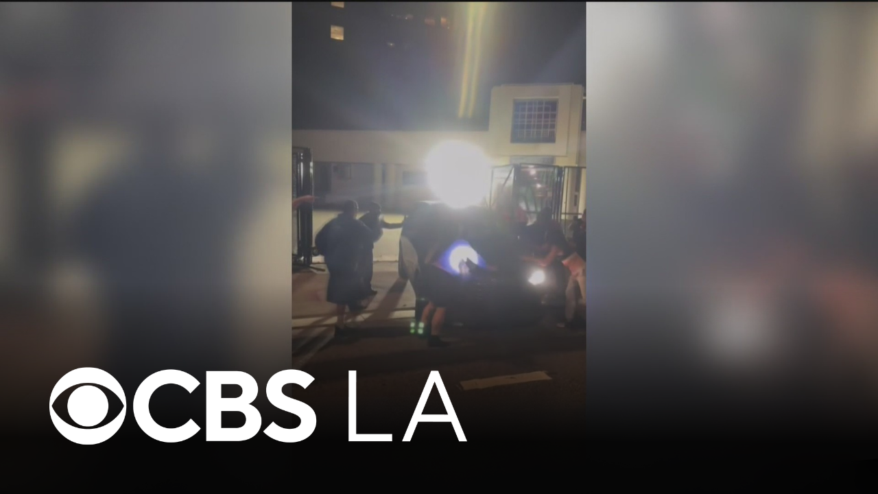 A woman who was protesting against immigration operations outside of the federal detention center in downtown Los Angeles on Friday night was struck by a car leaving the compound. Video of the incident, which appears to show the woman stepping in front of the vehicle, but she insists that wasn't the case. Hunter Sowards reports.