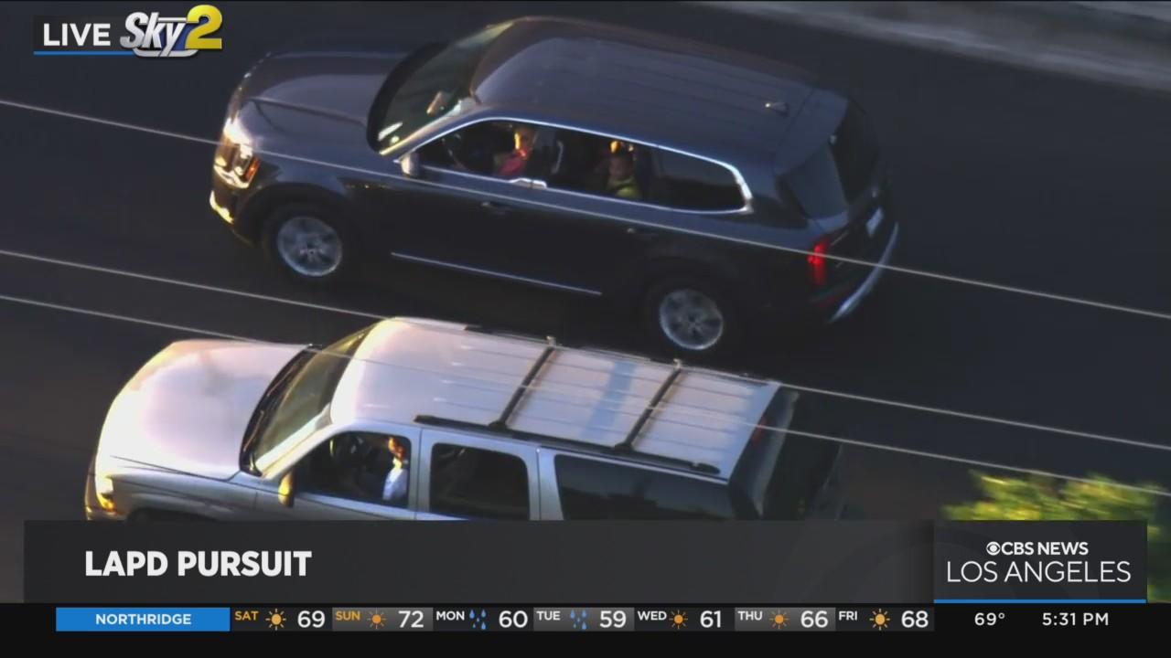 As the slow speed pursuit continues in El Sereno, the pursuit suspect appeared to be talking to the driver of a separate vehicles traveling alongside them.