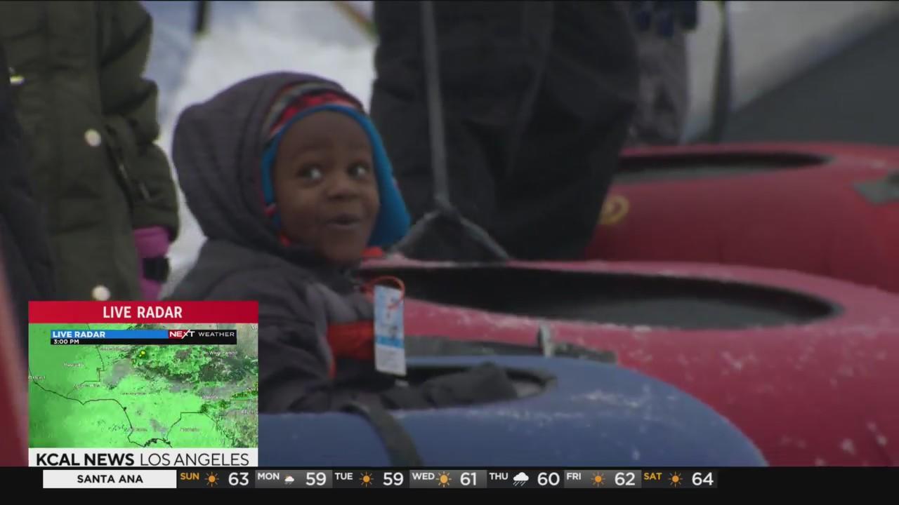 Rina Nakano reports from Wrightwood, where many families took advantage of the recent storms that hit the Southland, heading to a winter wonderland for snowball fights, tubing and more.
