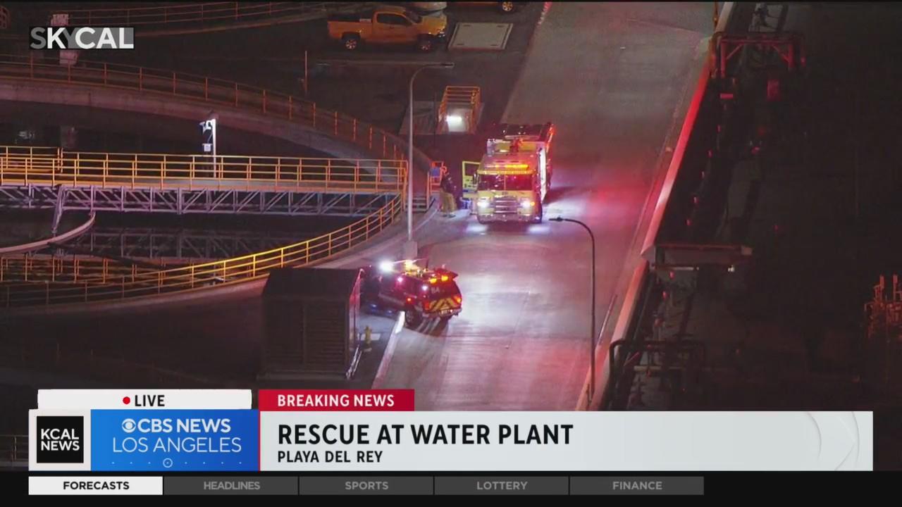Sky-CAL was over the scene of an emergency rescue at the Hyperion water plant in Playa del Rey, after a man in his 30s fell down a 20-feet deep shaft Thursday evening.