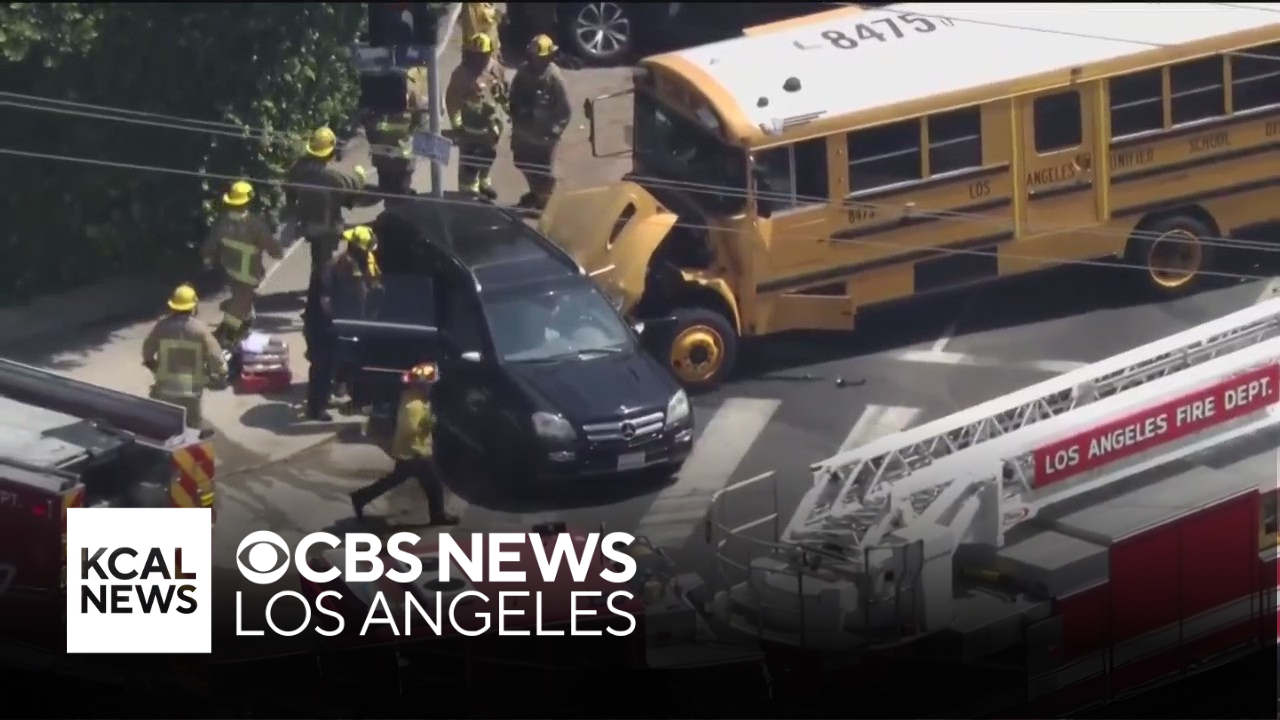 Aerial footage from the Arleta crash shows a yellow bus with front-end damage smashed, partially on a sidewalk. No children were on the bus at the time of the crash. Luzdelia Caballero reports.