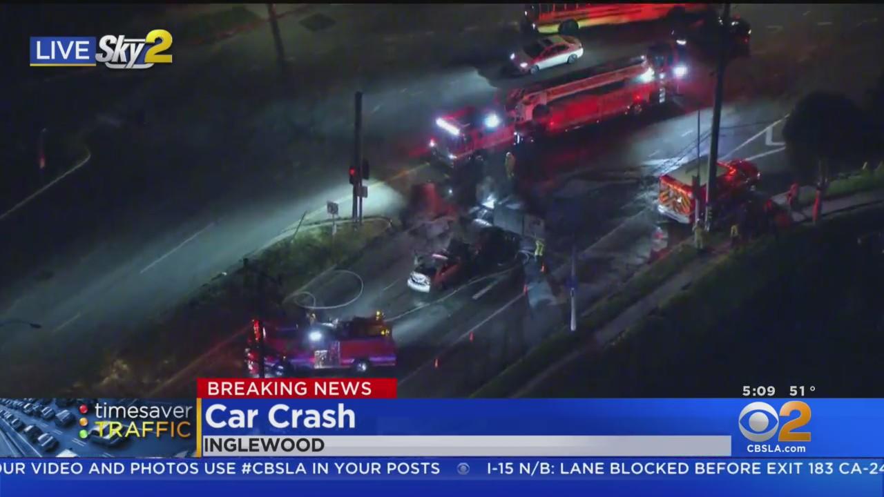 Sky2: Vehicle catches fire after head-on crash in Inglewood
