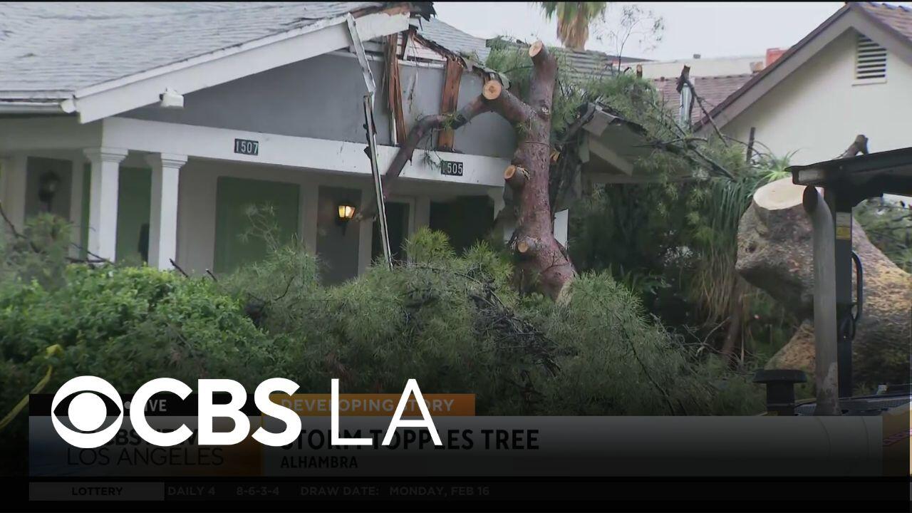 Monday’s storm caused trees to topple, one onto a home in Alhambra and another onto a car in Woodland Hills.