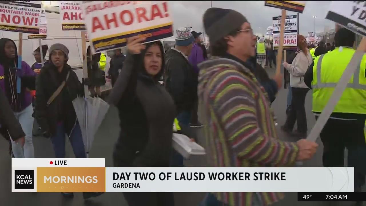 SEIU and UTLA members picketed Wednesday as a scheduled three-day strike continued into its second day, and Los Angeles Unified School District campuses remained closed. Kara Finnstrom reports.