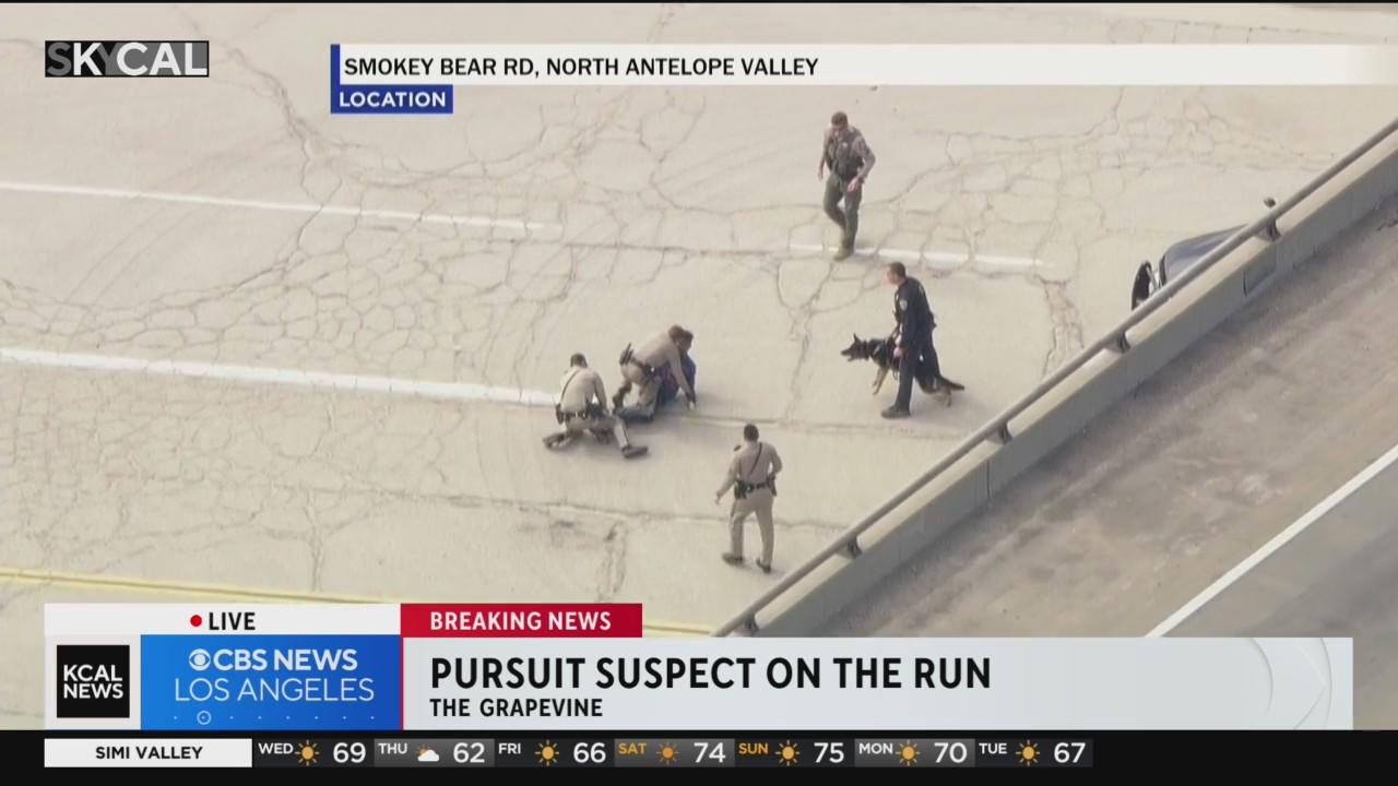 Police have arrested the suspect after he ran across the freeway and tried to carjack passersby.