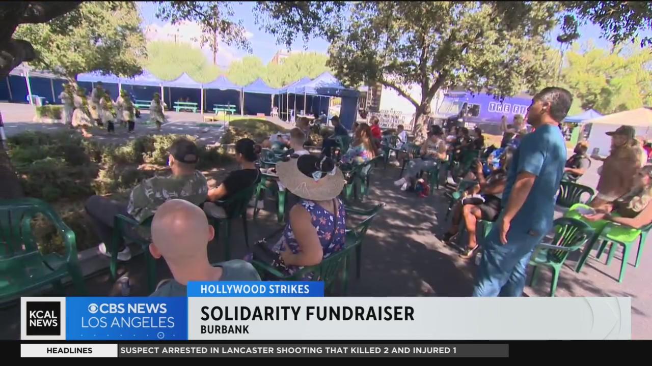 Lauren Pozen reports from Burbank, where members of multiple unions affected by the ongoing Hollywood strikes gathered on Saturday for a WGA solidarity fundraiser, as the group continues to fight for a better contract after more than 100 days on the picket lines.