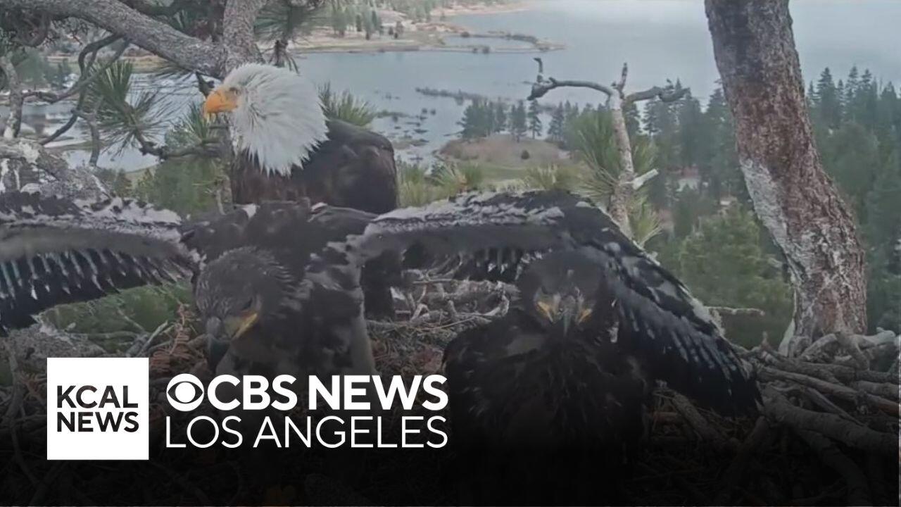 Gizmo and Sunny are six weeks old and continue to grow in their nest above Big Bear Valley. KCAL News speaks with Friends of Big Bear Valley about the popular eaglets.