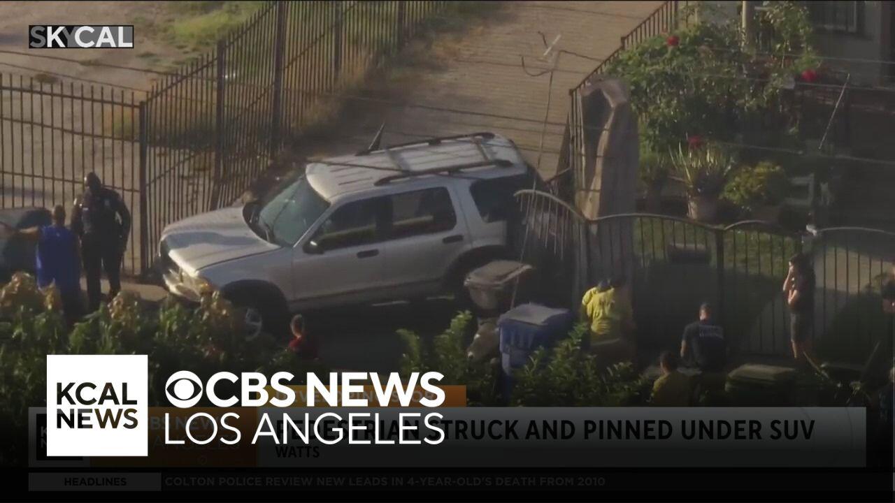 Vehicle crashes into a home’s fence and a pedestrian in Watts