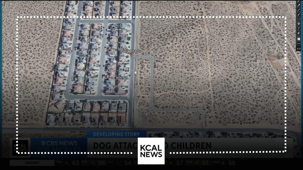 Authorities are looking for a dog that attacked two children as they walked to school in Victorville Thursday morning. One child got away, while the other suffered multiple injuries.