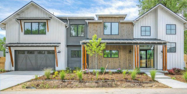 This three-bedroom, 3.5-bathroom, 2,581-square-foot McModern, built this year, is in Portland, Oregon. This house has numerous façade surface materials, like many of the other properties on this list. The concrete foundation is more visible on the left side of the house than the right, and the wood over the two-story entryway stands in stark contrast to the other paneling above it.