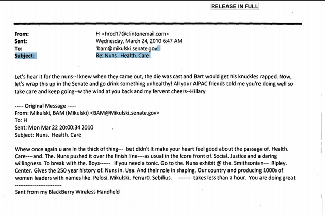 "Let's hear it for the nuns--I knew when they came out, the die was cast and Bart would get his knuckles rapped. Now, let's wrap this up in the Senate and go drink something unhealthy! All your AIPAC friends told me you're doing well so take care and keep going--w the wind at you back and my fervent cheers--Hillary"