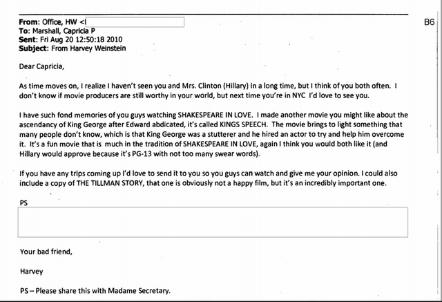 Aug. 20, 2010 from Harvey Weinstein to State Department official Capricia Marshall, forwarded to Hillary Clinton