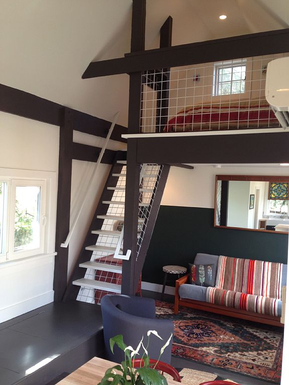 The 350-square-foot house has a loft with a queen bed, kitchenette, fold-down sleeper sofa, small claw-foot tub and private garden.