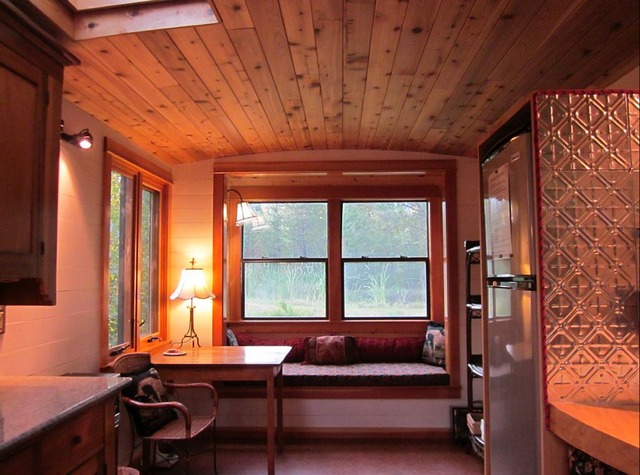 The 200-square-foot home has a queen-sized bed, skylights, gas stove, refrigerator, bathroom and an outdoor barbeque grill.