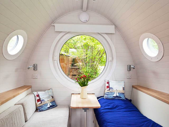 The boat-shaped cabin has two sofas that convert into one full or two single beds, a kitchenette, shower and toilet, television and internet.