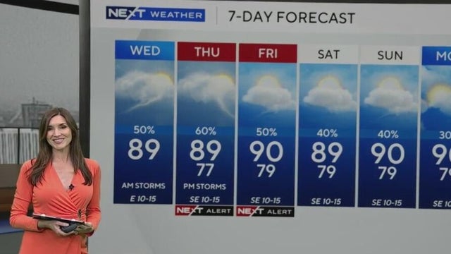 NEXT Weather meteorologist Lissette Gonzalez says scattered storms will continue through the early afternoon. A NEXT Weather Alert has been issued for Thursday and Friday due to the potential for heavy rainfall and damaging winds.