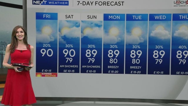 NEXT Weather meteorologist Lissette Gonzalez says the first day of summer will be a mix of sun and clouds with highs near 90 degrees. The weekend will be hot and humid.