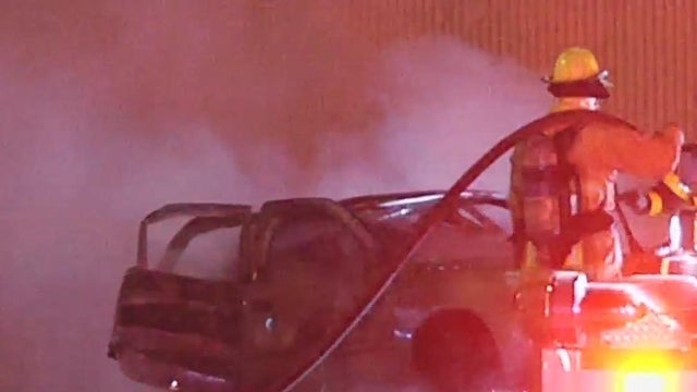 Florida Highway Patrol said a dark blue BMW crashed into the back of a gold Nissan, causing the vehicle to burst into flames.