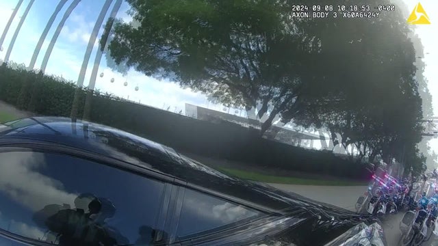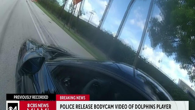 In this Miami-Dade police bodycam video, Miami Dolphins star receiver Tyreek Hill is seen on the ground as motorcycle officers put handcuffs on him.