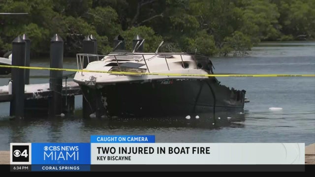 Two people were injured after a boat caught on fire in Key Biscayne on Sunday.