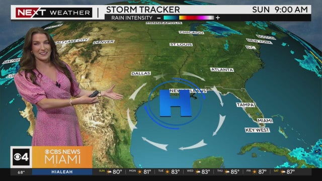 CBS News Miami's NEXT Weather Meteorologist KC Sherman says dry and partly cloudy conditions will continue in South Florida for Sunday as high pressure continues blocking storms from heading toward us into the week.