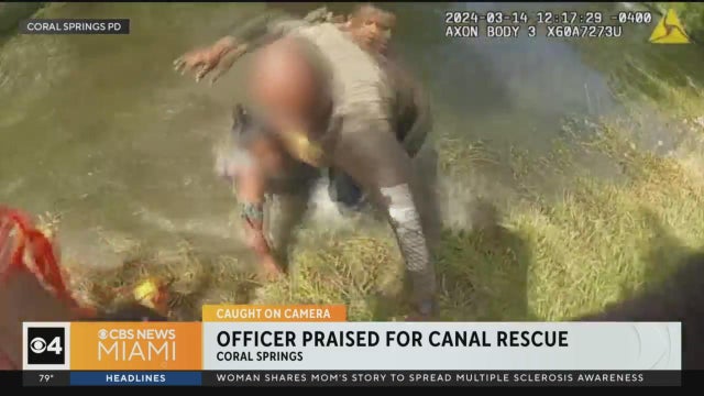 A heroic rescue was caught on camera when two people trapped inside of a car after it crashed into a Coral Springs canal were rescued by police.