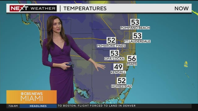 CBS News Miami's NEXT Weather Meteorologist Lissette Gonzalez says there's another chilly start with low to mid-50s and upper 40s this Wednesday morning, followed by a sunny, pleasant, dry afternoon ahead with highs in the low 70s.