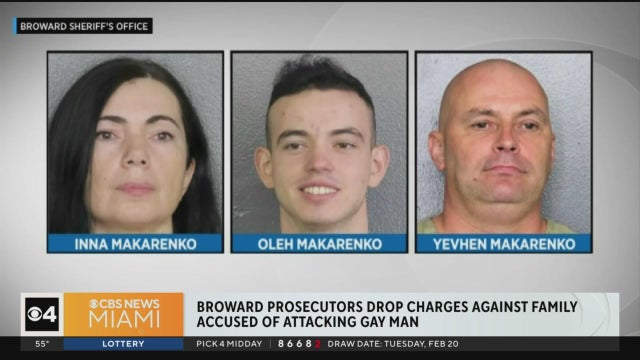Broward County prosecutors dropped criminal charges against a couple and their adult son who had been accused of severely beating a man who had been in a relationship with their son.